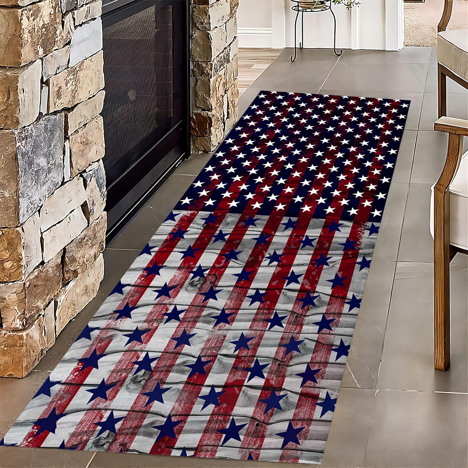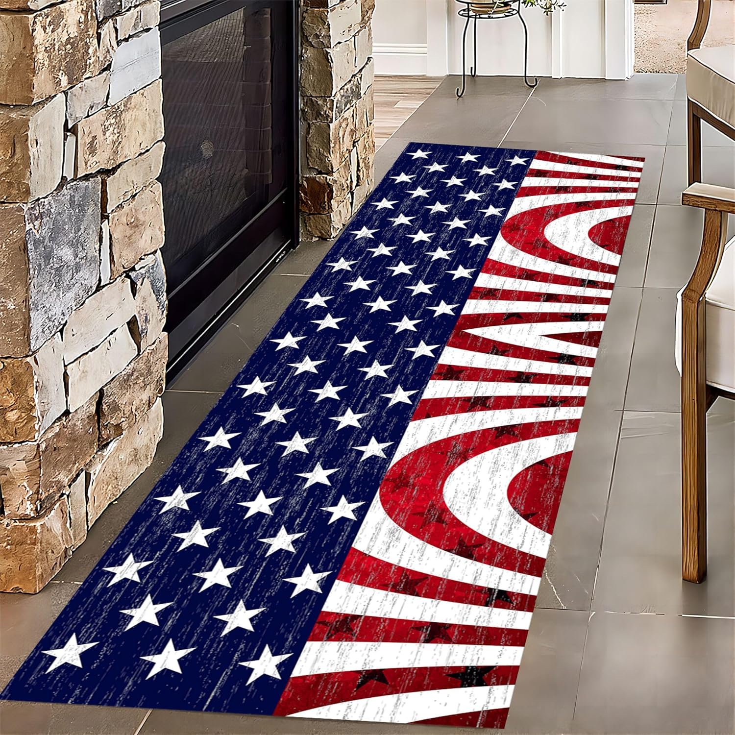 A simple carpet gives you a warm home~.Questions and AnswersQ1. Will this long-running crystal velvet carpet fade?A1. No, it will not fade.Q2. How should the carpet in this area be cleaned?A2. Please try to vacuum the carpet with a low-power handheld vacuum cleaner, which can easily remove surface dust. For deep cleaning, you can use machine washing or hand washing. Air dry or hang to dry after washing.Features of corridor carpet① Our corridor carpets are made of high-quality materials and sublimation technology, which are comfortable to the feet, durable and non-fading② Western kitchen runner rug's are washable, with a dotted non-slip bottom, and equipped with non-slip stickers x4, which are stable and non-slip, and fit the ground without displacement.③ American Western retro Texas star rug's runners for hallways living room bedroom kitchen kitchen dining room bathroom④ The American flag rug runner slide makes it a great solution for all your living space needs on Independence Day.⑤The indoor long strip carpet adopts the retro style design of Texas star, which is very suitable for western home decoration.⑥The American native long strip carpet is practical and stylish, which will definitely impress your guests.Shopping Guide1. Our carpets are compressed with vacuum bags. If there are creases, they will become fluffy after a few days and will not affect the use.2. Clean the carpet according to the washing instructions. Do not soak after washing 3. If you find that the product has an odor when you receive it, please place it in a ventilated place for a while.4. Due to the different display and camera shooting effects, there may be some differences between the picture and the actual color of the product.5. If you have any questions, please feel free to contact us.