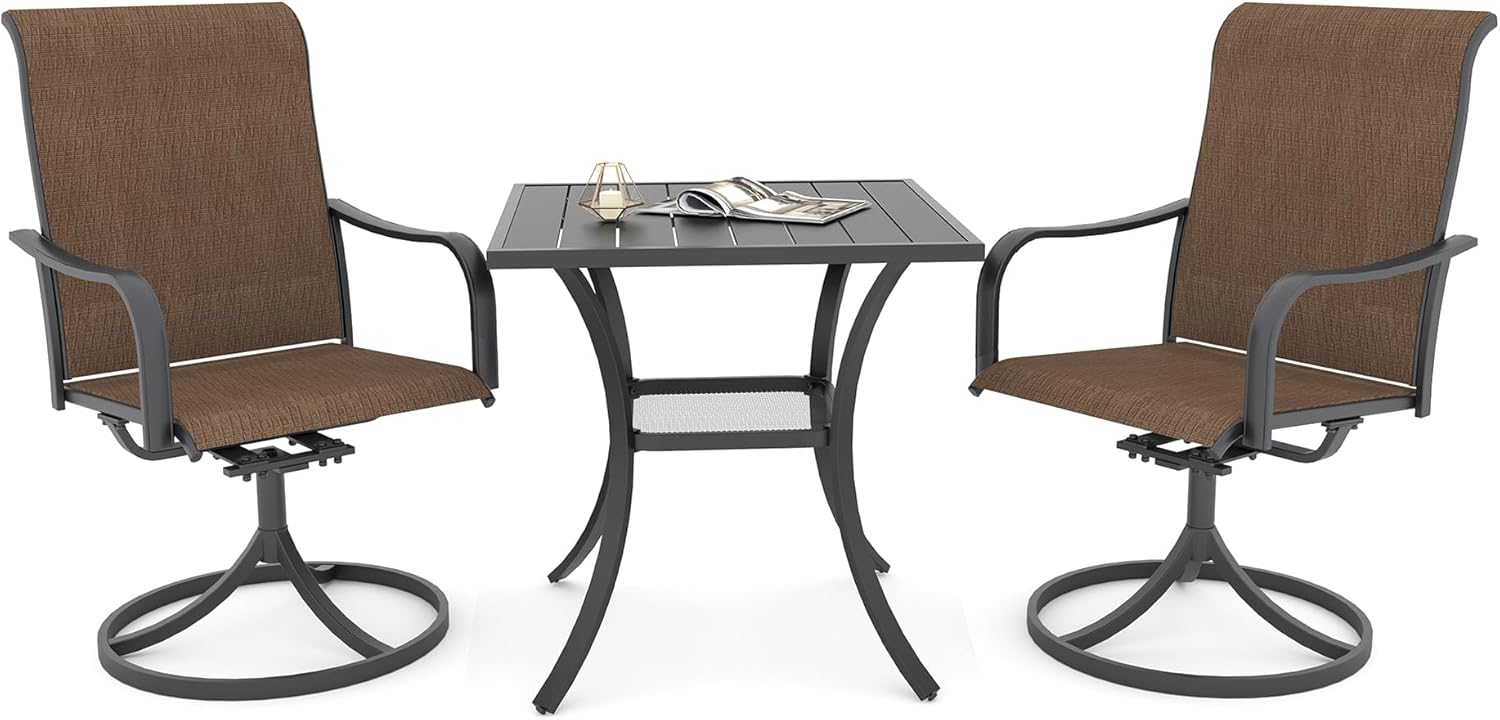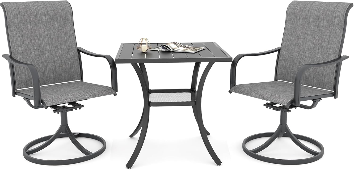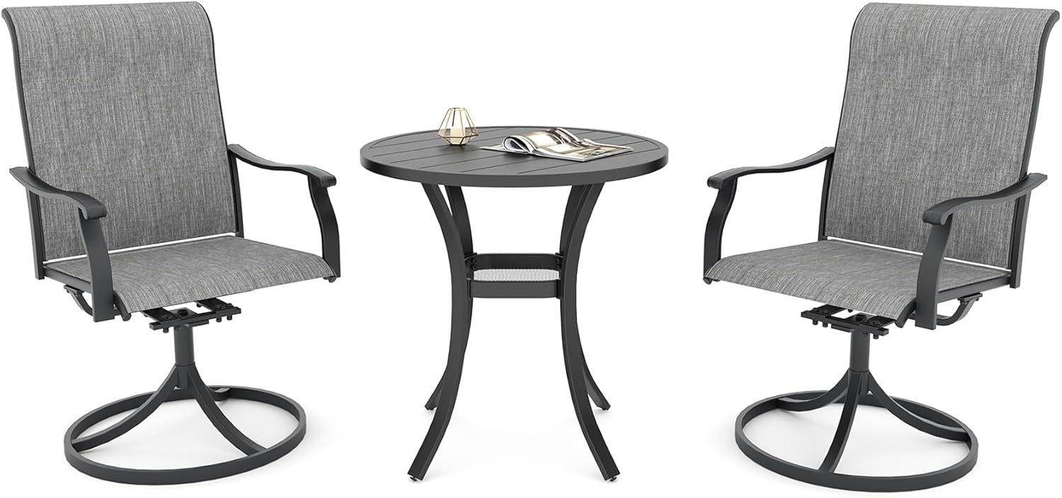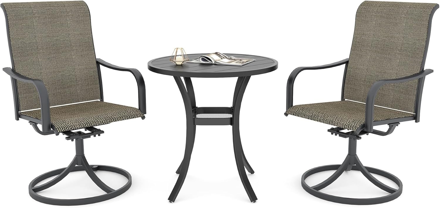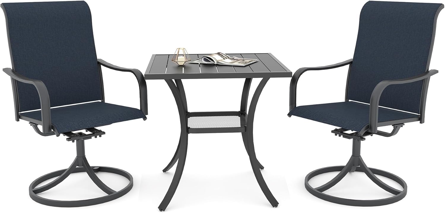 Detail: Package includes: 1 x round table parts, 2 x Style2 Navy Blue Swivel chairs parts, hardware, manual; ---Table--- Table Dimension: L27.5inch * W27.5inch * H28inch; Table Color: Black; Table Top Material: Metal; Table Frame Material: Metal; Table Suface: E-Coating ---Chair--- Chair Weight Limit: <300 lbs; Chair Function: Support stackable storage; Chair Color: Navy Blue; Chair Frame: Metal; Chair Frame Color: Black; Chair Seat and Back: Textilene fabric(excellent breathability and ductility, can be used for a long time); Application: Suitable for 2 person dining;