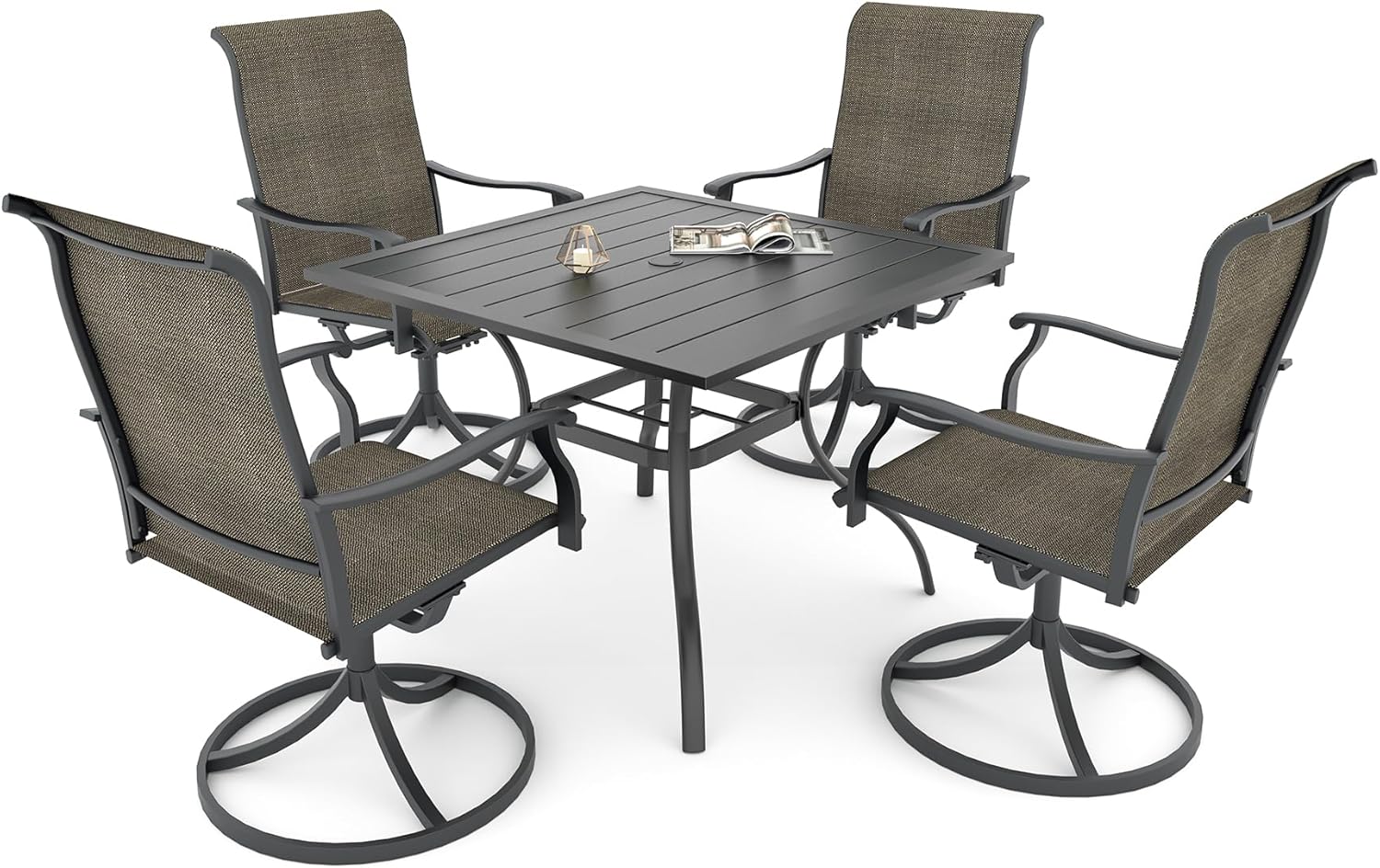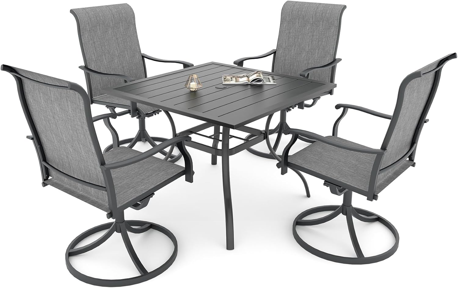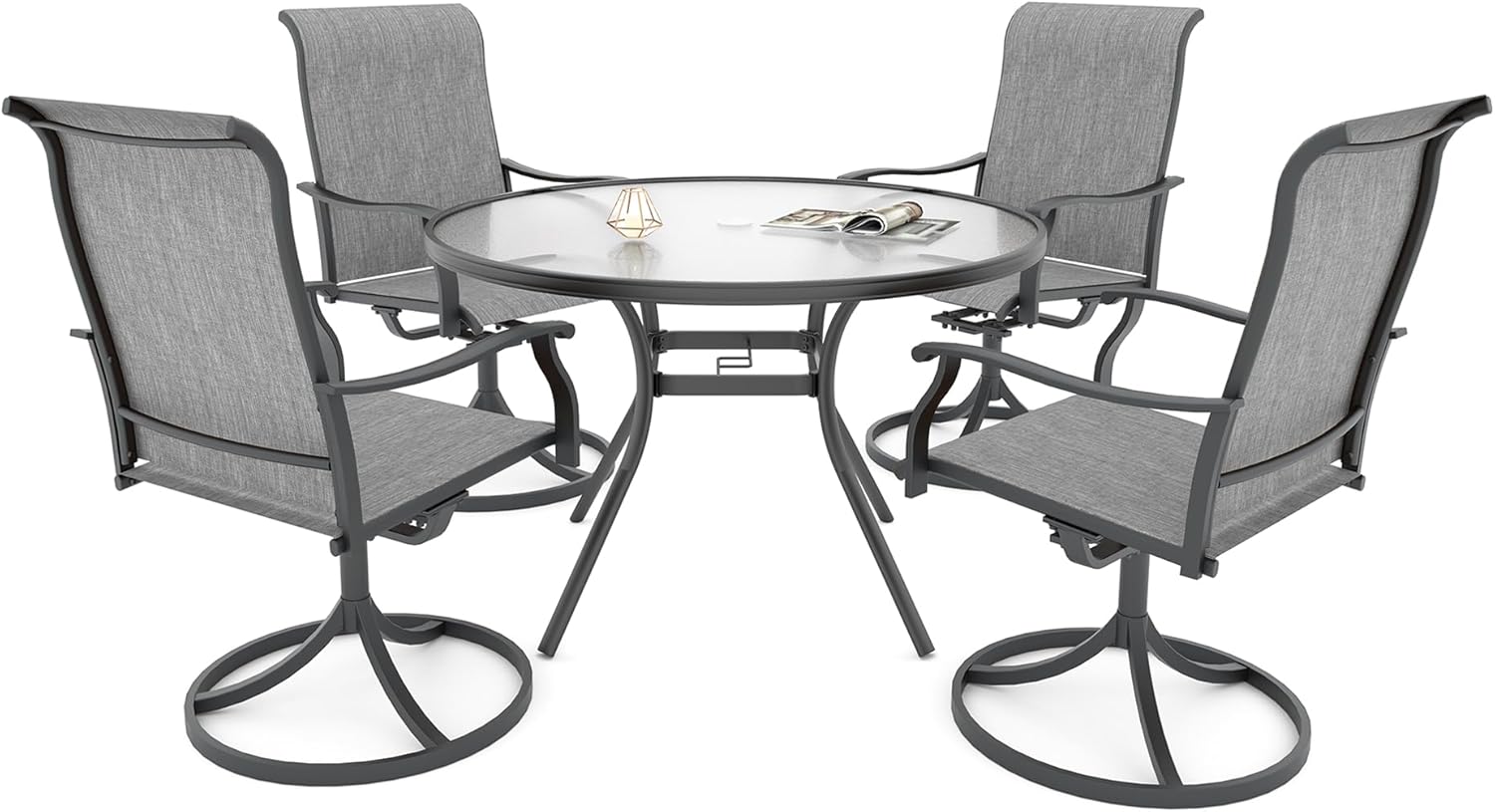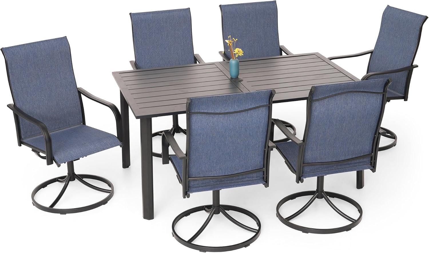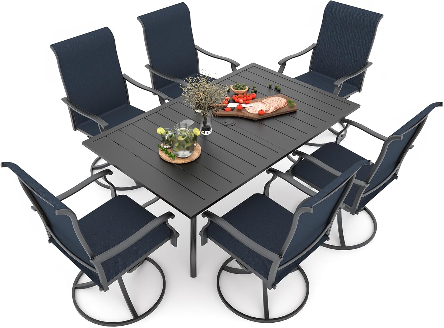 Detail: Package includes: 1 x round table parts, 2 x Style2 Navy Blue Swivel chairs parts, hardware, manual; ---Table--- Table Dimension: L27.5inch * W27.5inch * H28inch; Table Color: Black; Table Top Material: Metal; Table Frame Material: Metal; Table Suface: E-Coating ---Chair--- Chair Weight Limit: <300 lbs; Chair Function: Support stackable storage; Chair Color: Navy Blue; Chair Frame: Metal; Chair Frame Color: Black; Chair Seat and Back: Textilene fabric(excellent breathability and ductility, can be used for a long time); Application: Suitable for 2 person dining;