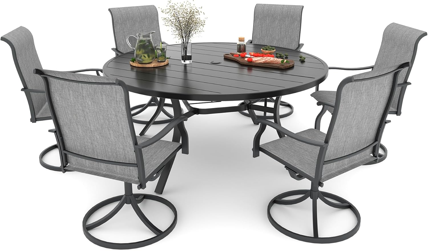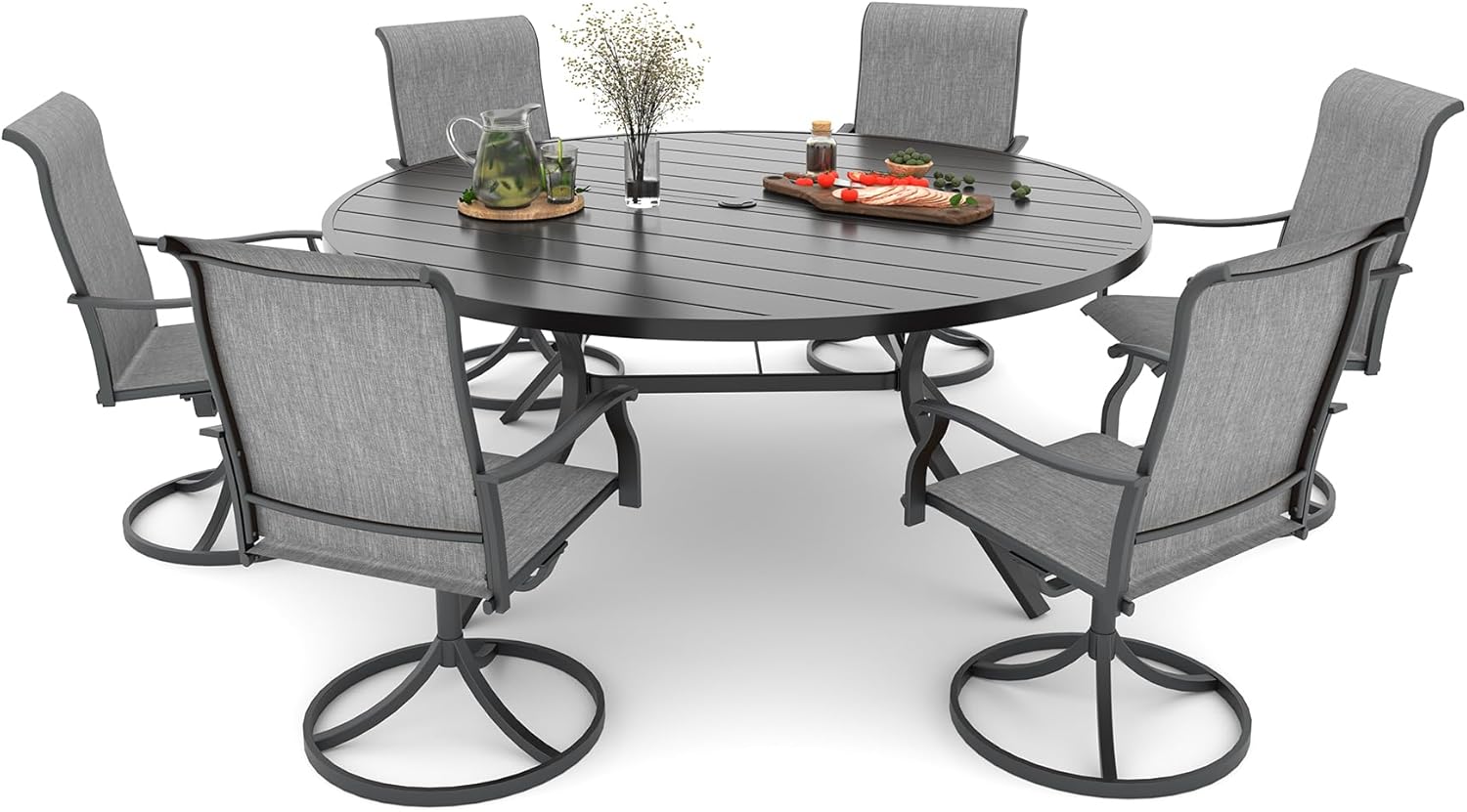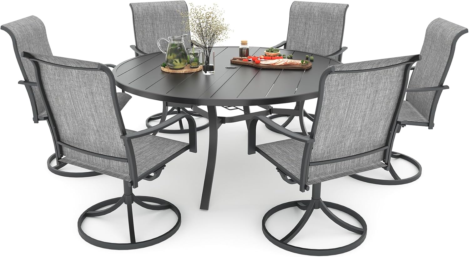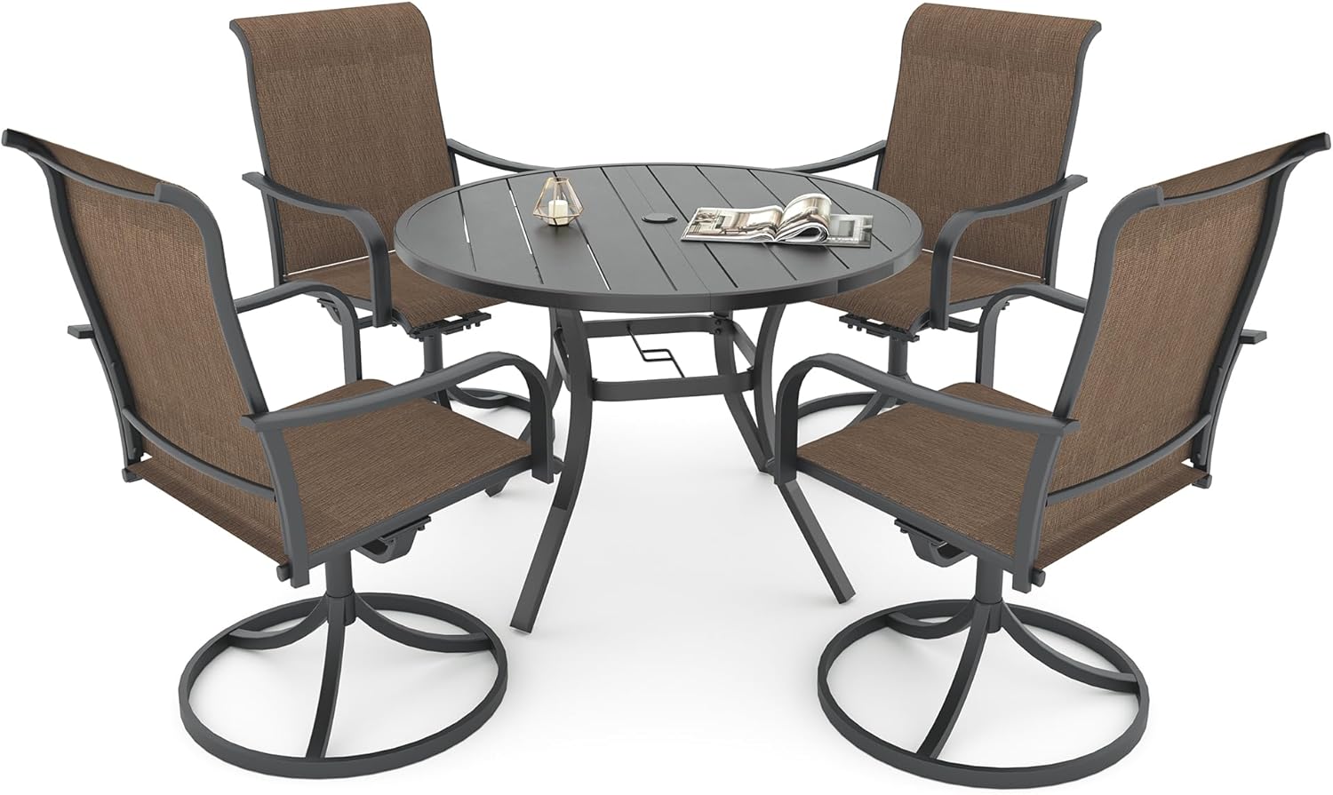 Detail: Package includes: 1 x round table parts, 2 x Style2 Navy Blue Swivel chairs parts, hardware, manual; ---Table--- Table Dimension: L27.5inch * W27.5inch * H28inch; Table Color: Black; Table Top Material: Metal; Table Frame Material: Metal; Table Suface: E-Coating ---Chair--- Chair Weight Limit: <300 lbs; Chair Function: Support stackable storage; Chair Color: Navy Blue; Chair Frame: Metal; Chair Frame Color: Black; Chair Seat and Back: Textilene fabric(excellent breathability and ductility, can be used for a long time); Application: Suitable for 2 person dining;