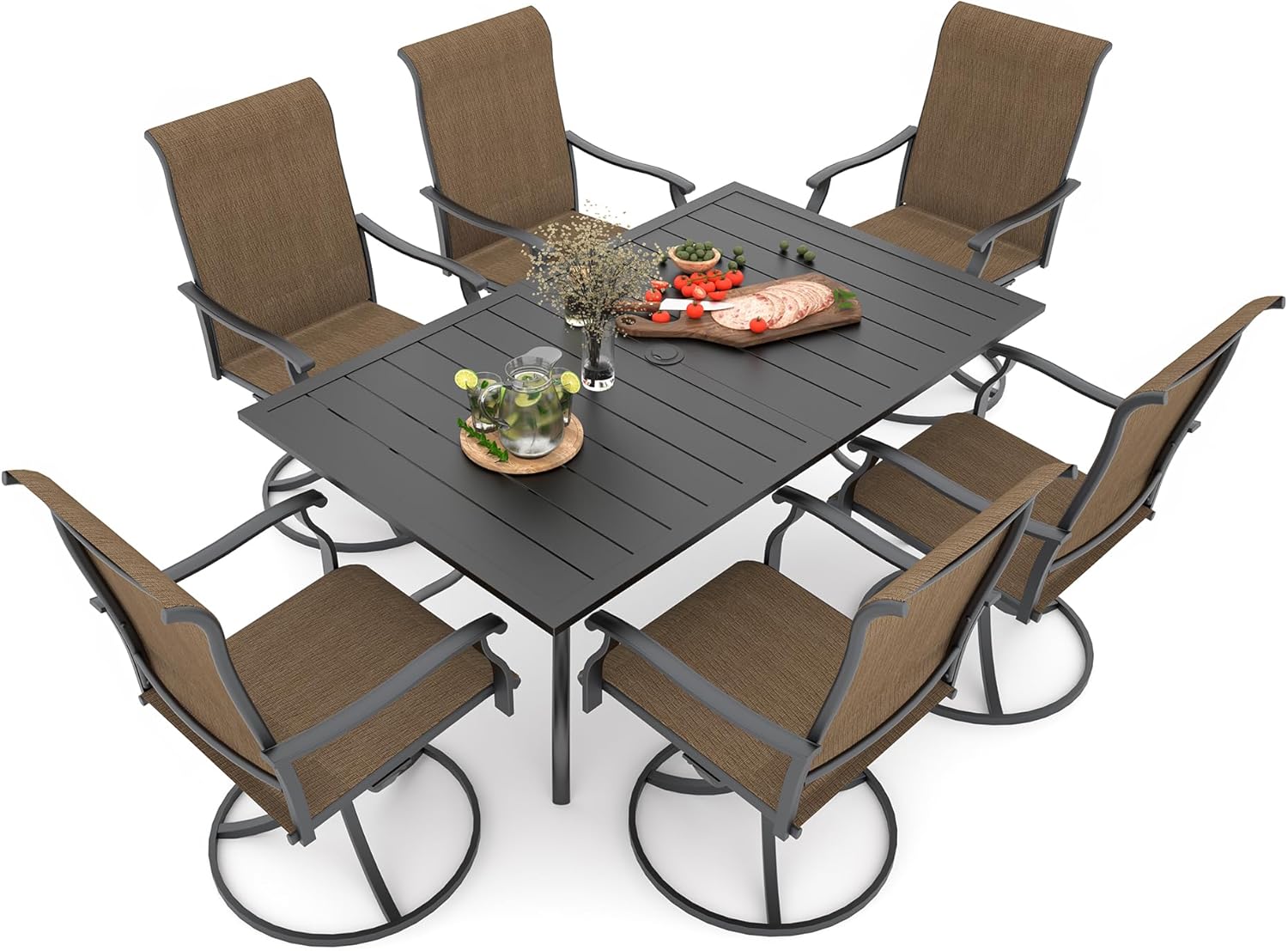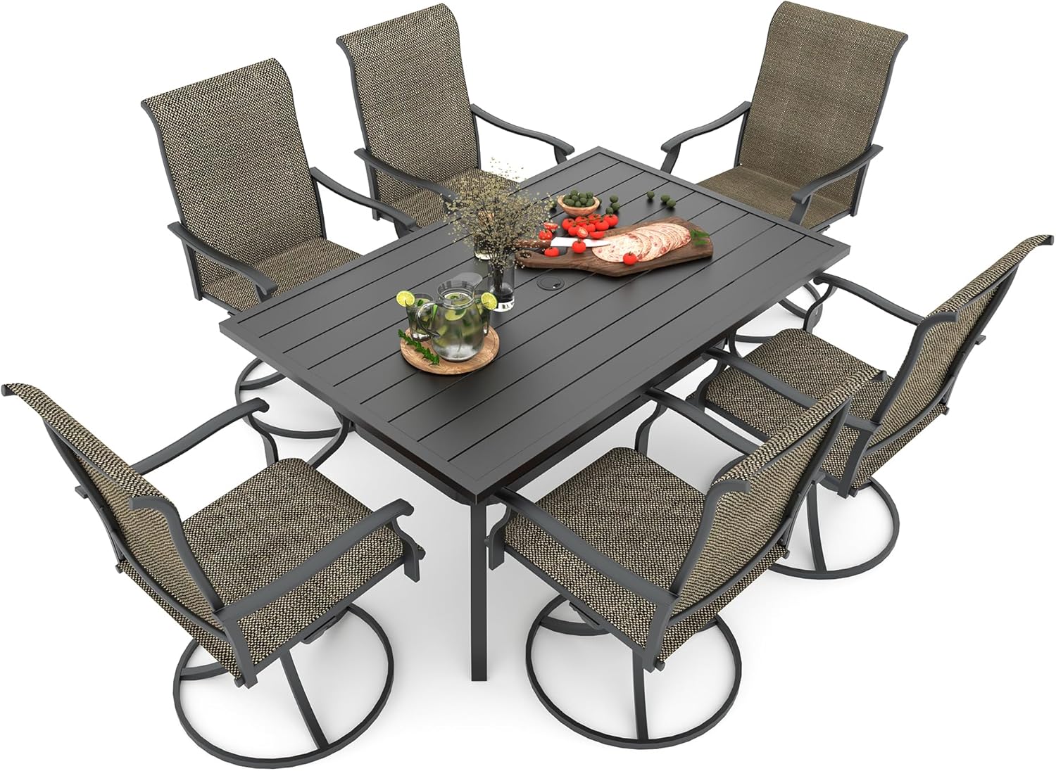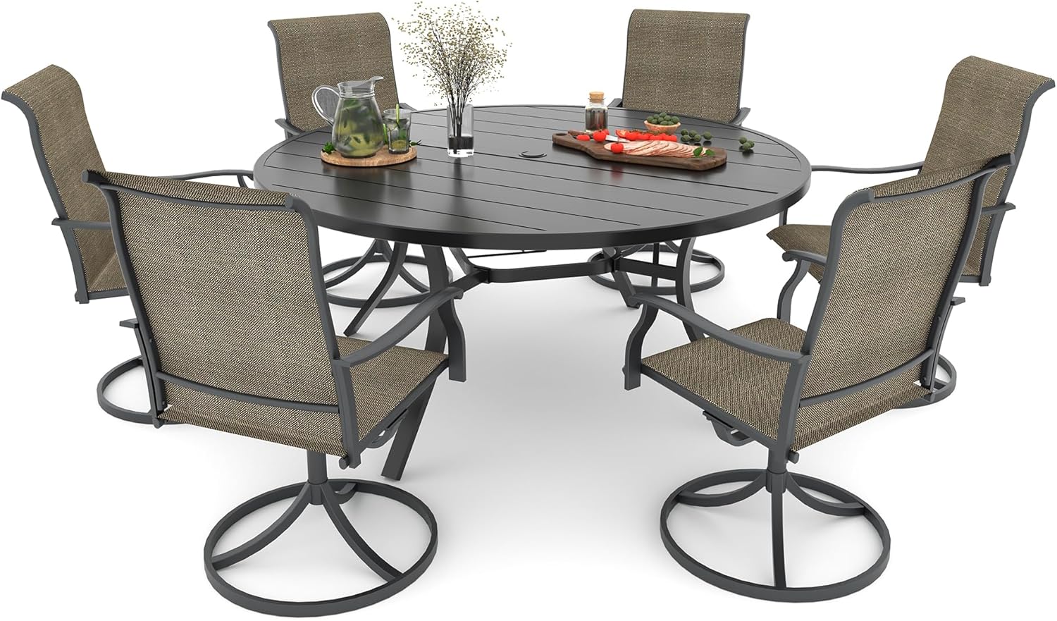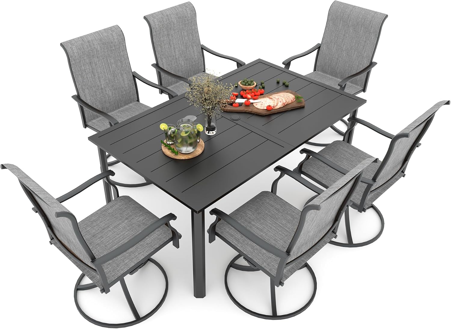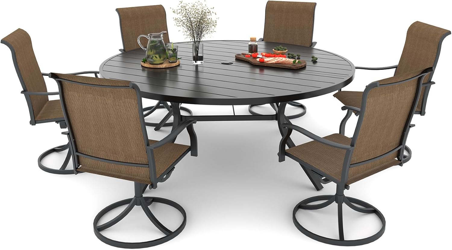 Detail: Package includes: 1 x round table parts, 2 x Style2 Navy Blue Swivel chairs parts, hardware, manual; ---Table--- Table Dimension: L27.5inch * W27.5inch * H28inch; Table Color: Black; Table Top Material: Metal; Table Frame Material: Metal; Table Suface: E-Coating ---Chair--- Chair Weight Limit: <300 lbs; Chair Function: Support stackable storage; Chair Color: Navy Blue; Chair Frame: Metal; Chair Frame Color: Black; Chair Seat and Back: Textilene fabric(excellent breathability and ductility, can be used for a long time); Application: Suitable for 2 person dining;