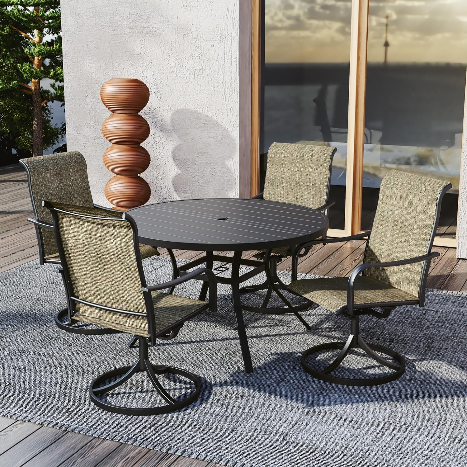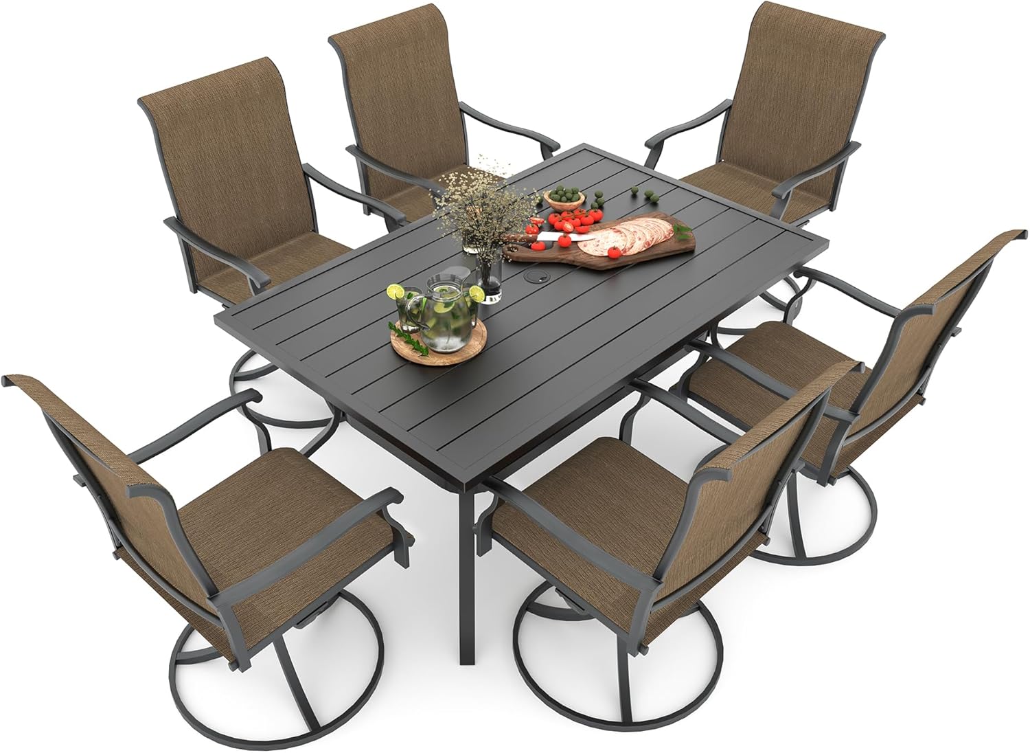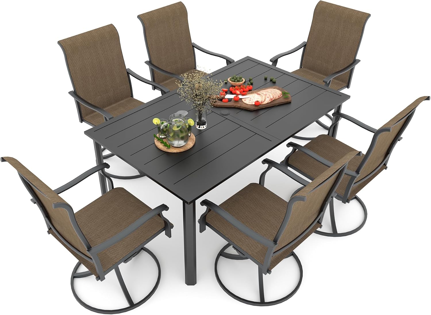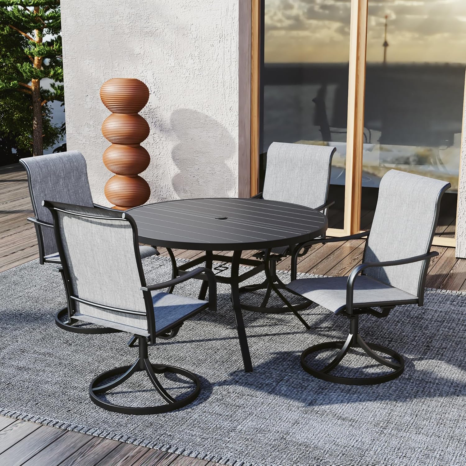 Detail: Package includes: 1 x round table parts, 2 x Style2 Navy Blue Swivel chairs parts, hardware, manual; ---Table--- Table Dimension: L27.5inch * W27.5inch * H28inch; Table Color: Black; Table Top Material: Metal; Table Frame Material: Metal; Table Suface: E-Coating ---Chair--- Chair Weight Limit: <300 lbs; Chair Function: Support stackable storage; Chair Color: Navy Blue; Chair Frame: Metal; Chair Frame Color: Black; Chair Seat and Back: Textilene fabric(excellent breathability and ductility, can be used for a long time); Application: Suitable for 2 person dining;